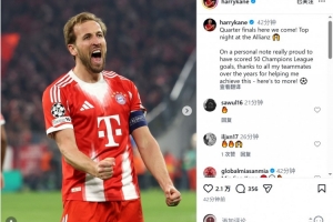 凱恩社媒曬出慶祝進(jìn)球的照片,配文:“四分之一決賽,我們來了!安聯(lián)球場(chǎng)的精彩夜晚!”