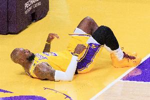末節(jié)詹姆斯在一次反擊中被小賈巴里·史密斯犯規(guī)放倒,老詹躺在地上表情痛苦。