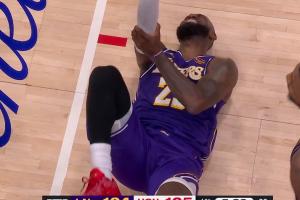 GIF-燃盡了!詹姆斯先連續防守又全力沖刺上籃被犯規 手肘再次受傷!