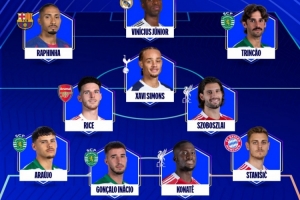 體育資訊3月20日訊 歐冠1/8決賽次回合結(jié)束了全部的爭奪,歐足聯(lián)官方評選出了周最佳陣,拉菲尼亞、維尼修斯、賴斯以及索博斯洛伊入選。