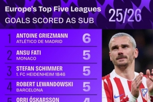 體育資訊3月20日訊 本賽季,馬競老將格列茲曼依然保持著良好的狀態,盡管西蒙尼主要將他作為替補使用。本賽季迄今為止,格列茲曼在西甲中替補登場已打進6球,位居五大聯賽所有球員之首。