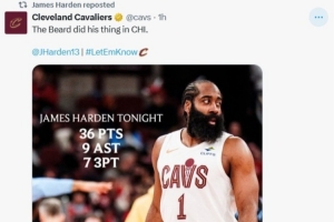 賽后騎士官方曬哈登數據海報,配文寫道:大胡子在芝加哥大顯身手。