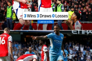 體育資訊3月20日訊 數據顯示,阿森納過去6場對陣曼城保持不敗。
