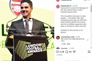 體育資訊3月9日訊 阿森納主帥阿爾特塔榮膺倫敦足球網評選的年度最佳主教練。在社交媒體上,西班牙教頭曬出了自己的獲獎照并表達了感謝之情。