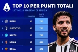 體育資訊3月21日訊 德國轉會市場統計了過去10個賽季各隊在意甲的總積分,并列出榜單,國米775分居首,尤文773分次席。