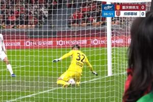 比賽第6分鐘,向余望搶點(diǎn)打門,劉殿座在門線上將球控制住。