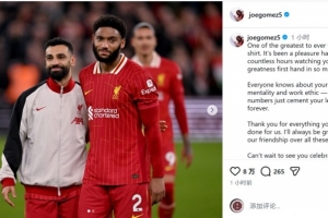 喬·戈麥斯社媒曬出與薩拉赫的合照,并寫道:“你是身穿這件球衣的最偉大球員之一。能有無數小時親眼見證你在方方面面的卓越表現,這是我的榮幸。”