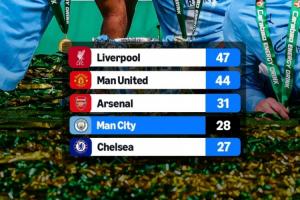 外媒列英格蘭球隊歷史奪冠榜:曼城28冠超藍軍獨占第4,距槍手3冠
