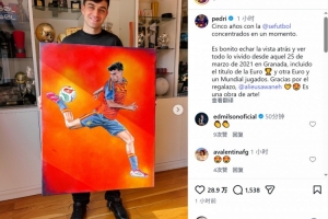 佩德里獲贈(zèng)一幅畫作,內(nèi)容為他身穿西班牙國(guó)家隊(duì)球衣的形象,佩德里社媒曬出這幅畫作,配文:“西班牙國(guó)家隊(duì)的五年時(shí)光,所有回憶凝聚于此刻?;厥淄率嵌嗝疵篮?,自2021年3月25日在格拉納達(dá)的那個(gè)日子以來,我們經(jīng)歷了太多,包括一座歐洲杯冠軍,以及另外一次歐洲杯和世界杯的征程。感謝這份厚禮,這簡(jiǎn)直是一件藝術(shù)品!”