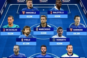 中場:德西利奧(AC米蘭,1200萬)、皮爾洛(尤文圖斯,750萬)、馬爾基西奧(尤文圖斯,2800萬)、維拉蒂(巴黎圣日耳曼,2000萬)、達米安(都靈,450萬)