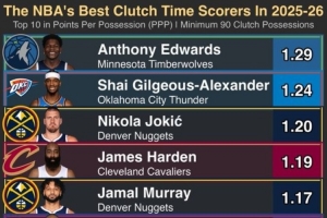 本賽季關鍵時刻每回合得分top10:華子1.29分第1 哈登第4 KD第8