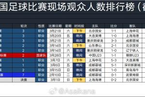 體育資訊3月29日訊 德轉管理員朱藝發布了2026年中國足球比賽現場觀眾人數排行榜(截至3.28)。