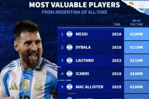 阿根廷歷史身價排行:梅西1.8億歐第一,恩佐第7迪馬利亞第10