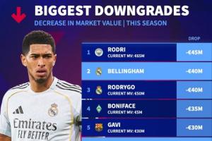 體育資訊03月31日訊 德轉(zhuǎn)盤點(diǎn)了本賽季目前球員身價(jià)下跌榜,其中羅德里下降4500萬歐最多,貝林、羅德里戈下降4000萬歐。