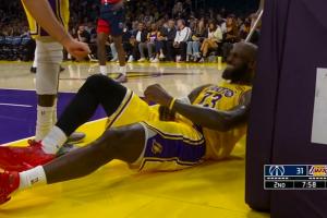 GIF-詹姆斯上籃倒地 和裁判說幾句 抱怨被打手了