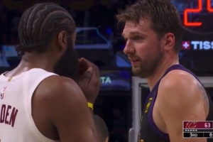 GIF-哈登和東契奇在場上聊天,還捂著胡子