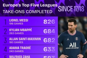 體育資訊4月1日訊 Squawka列出了17-18賽季以來五大聯賽成功過人排名,梅西826次居首,姆巴佩684次第二。