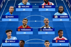中場:若昂·佩德羅(切爾西,22球)、B費(曼聯(lián),24球)、吉馬良斯(紐卡,15球)、塞梅尼奧(伯恩茅斯/曼城,19球)