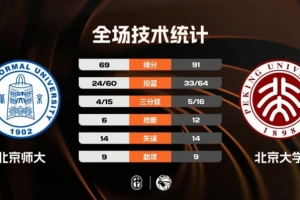 易邊再戰,北京師大的進攻直接斷電,他們在前四分鐘的時間里一分未得,北京大學則趁勢打出一波11-0的小高潮將分差直接擴大到二十分以上,雖然北京師大在本節后半段有追分勢頭,但分差始終保持在兩位數,三節結束,北京大學62-49領先北京師大。