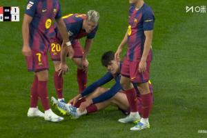 體育資訊04月05日訊 西甲第30輪,馬競對陣巴薩。60分鐘,貝爾納爾受傷坐在地上,被孔德?lián)Q下。