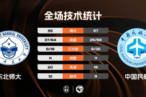 末節比賽,中國民航先拿5分縮小分差,東北師大及時調整給出回應,僵持半節之后中國民航的外線突然投開,連續命中三分球后分差僅剩3分,關鍵時刻閆思愷也是強投三分命中幾乎殺死了中國民航逆轉的希望,最終東北師大力克中國民航成功晉級。