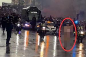 據(jù)TA記者Guillermo Rai在現(xiàn)場(chǎng)的拍攝,皇馬大巴在球迷的簇?fù)碇星巴{烏球場(chǎng),而大巴前還跑過一名裸男。