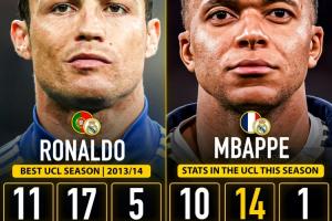 姆巴佩本賽季歐冠出戰10場比賽已經打進14球,高居射手榜第一。而在歐冠單賽季總進球排行榜上,姆巴佩距離C羅在2013/14賽季的17球紀錄還有3球之差。