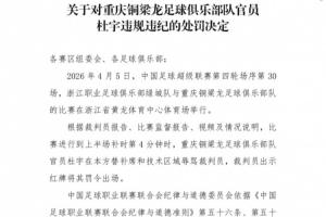 體育資訊04月08日訊 中足聯官網今日公布處罰決定,中超第4輪,浙江vs重慶銅梁龍,重慶銅梁龍助理教練杜宇辱罵裁判員,禁止進入體育場6場,罰款6萬元。