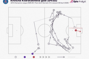據統計,克瓦拉茨赫利亞進球前巴黎共完成27次連續傳球,在本賽季歐冠僅有3粒進球比這次破門前傳球次數更多。