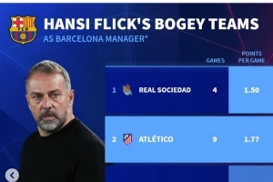 弗里克執教巴薩以來克星排名(至少對陣3場):