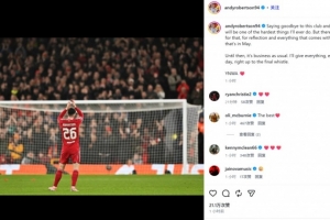 羅伯遜曬出自己向安菲爾德的謝場照,并表示:“告別這家俱樂部和球迷們將是我人生中最艱難的決定之一。但此后將會有那么一個時刻,讓我好好回顧并感受一切——那就是五月份。”