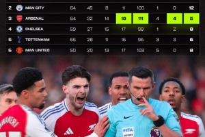 博主:奧利弗執法阿森納和曼城均為64場,但從未向后者出示紅牌