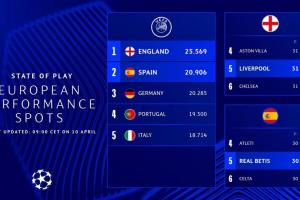 歐足聯(lián)官方:英超下賽季鎖定5個歐冠名額 西甲暫第二德甲葡超三四