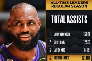 詹姆斯常規賽生涯總助攻數突破12000,NBA歷史第四人,僅次于斯托克頓、保羅和基德。
