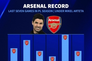 阿爾特塔執教阿森納賽季最后7輪比賽拿分: