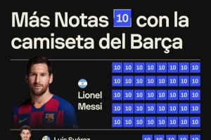 體育資訊4月13日訊 Sofascore統計了有評分以來球員巴薩生涯的10分場次,并列出榜單,梅西40場斷層居首。