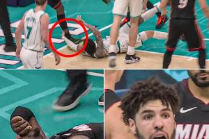 在第二節的一次進攻倒地后,黃蜂球星拉梅洛·鮑爾順勢抓到了熱火內線阿德巴約的腳踝,致使后者失衡重摔在地,隨后返回更衣室。