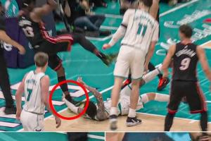 GIF-這動(dòng)作不好!三球用手扒阿德巴約腳后跟致其倒地受傷,已回更衣室!