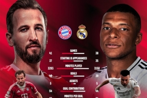 體育資訊4月15日訊 北京時(shí)間明天凌晨,拜仁將在歐冠1/4決賽次回合比賽中主場(chǎng)對(duì)陣皇馬,首回合拜仁2-1取勝。拜仁官方社媒曬出了凱恩、姆巴佩本賽季的數(shù)據(jù)。