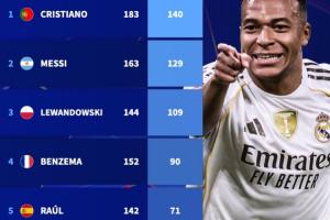 體育資訊04月16日訊 歐冠1/4決賽次回合,皇馬3-4總比分4-6不敵拜仁被淘汰,姆巴佩打入個人本賽季歐冠第15球,并達成歐冠70球里程碑,排名歷史第6,距離第5的勞爾僅差一球。