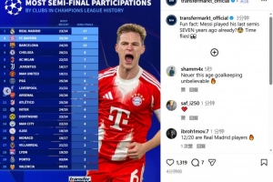 根據德轉的數據統計,這是拜仁歷史上第14次挺進歐冠四強,排在第二位,僅次于17次進入四強的皇馬。