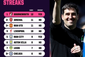 體育資訊4月16日訊 據(jù)Opta統(tǒng)計,伯恩茅斯是本賽季英超連續(xù)不敗場次最多的球隊。