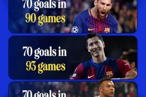 CBS體育曬圖,統計球員打進歐冠70球時所用的場次。其中梅西90場70球歷史最快,萊萬93場70球第二,姆巴佩98場70球第三。