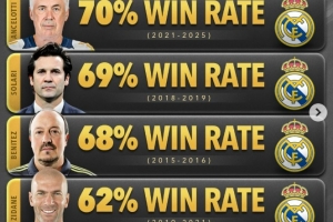 體育資訊4月16日訊 在歐冠淘汰賽次回合,皇馬3-4不敵拜仁遭淘汰,本賽季面臨可能四大皆空的局面。數(shù)據(jù)網(wǎng)站Score90也盤點(diǎn)了皇馬近6位主帥勝率榜,具體如下: