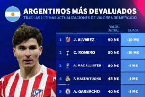體育資訊4月17日訊 德國轉(zhuǎn)會市場更新了球員的身價,列出了阿根廷球員身價下跌榜,阿爾瓦雷斯、羅梅羅下跌1000萬歐最多。