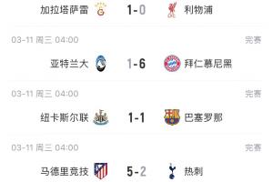 體育資訊03月12日訊 歐冠1/8決賽首回合比賽結束,種子隊只有拜仁客場取勝。