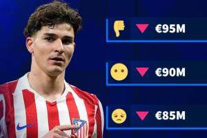 德轉(zhuǎn)給出了阿爾瓦雷斯身價(jià)變動(dòng)的4個(gè)可能選項(xiàng):9500萬(wàn)歐元、9000萬(wàn)歐元、8500萬(wàn)歐元、8000萬(wàn)歐元,目前阿爾瓦雷斯的身價(jià)為1億歐元,這也意味著他的身價(jià)一定會(huì)迎來(lái)下跌。