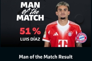 體育資訊3月15日訊 德甲第26輪,拜仁客場1-1戰(zhàn)平勒沃庫森,賽后拜仁邊鋒路易斯·迪亞斯51%得票率當選全場最佳球員。