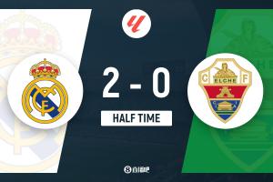 第39分鐘,皇馬禁區(qū)前沿獲得任意球機會,巴爾韋德大力抽射,球被門將撲出,隨后埃爾切球員解圍沒頂遠,呂迪格迎球抽射打進,皇馬1-0領(lǐng)先!↓