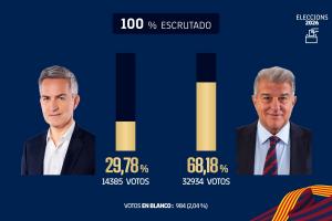 巴薩俱樂部主席選舉結(jié)束,拉波爾塔成功當(dāng)選。他獲得了32934張票,得票率68.18%。《世界體育報(bào)》指出,在巴薩俱樂部歷史上的所有主席選舉中,得票數(shù)比拉波爾塔更高的只有2010年的羅塞爾,當(dāng)時(shí)他獲得了35021張票。而得票率比拉波爾塔更高的只有1997年的努涅斯,當(dāng)時(shí)他的得票率是76.31%。